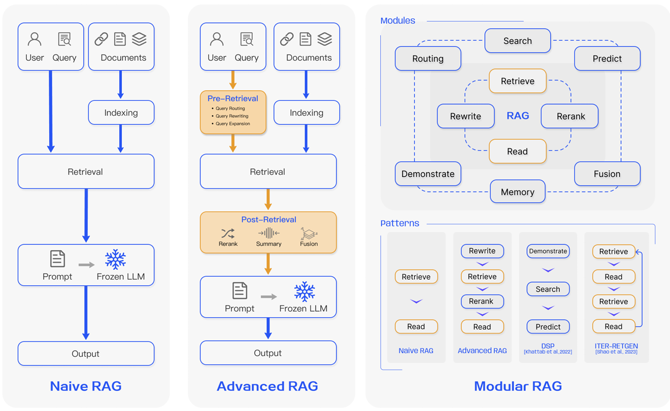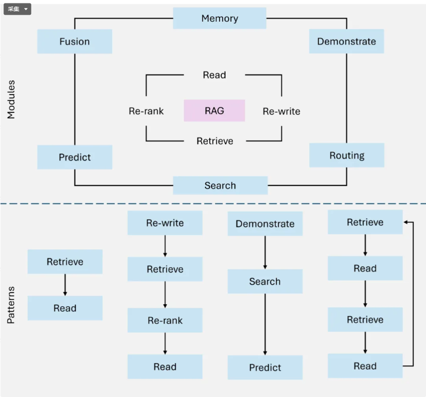 模块化RAG增强了功能模块,例如整合搜索模块以进行相似性检索以及在检索器中应用微调。普通RAG和高级RAG都是模块化RAG的特殊情况,由固定模块组成。